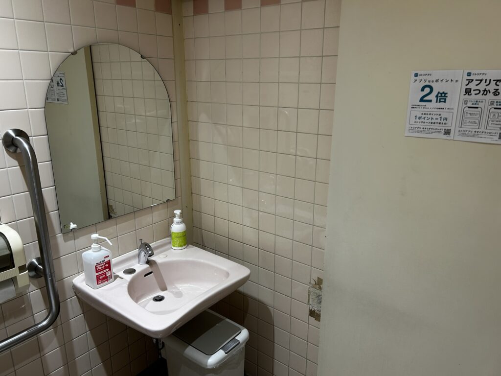 洗面台の下のゴミ箱がちょっと気になりました。スペース的にはちょうど良いのだと思いますが、車椅子で手洗いを利用しようとすると、ゴミ箱が引っかかって手が届かない恐れがあります。