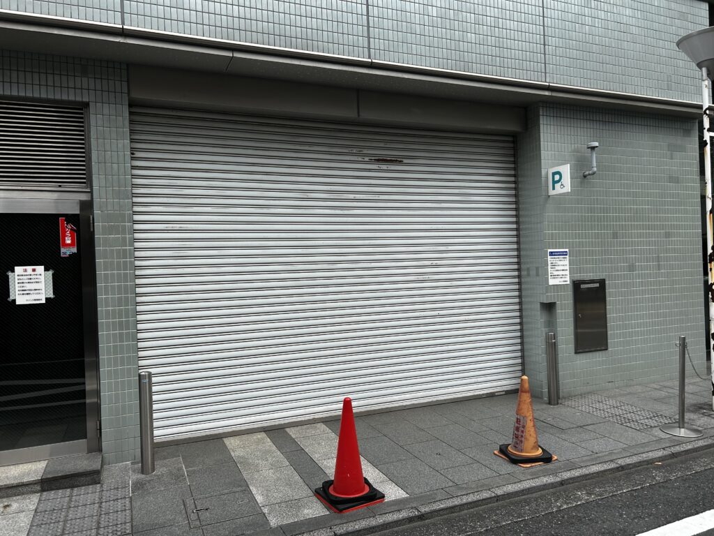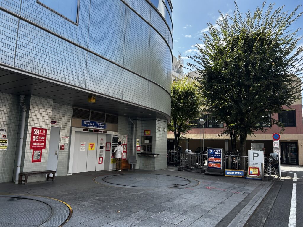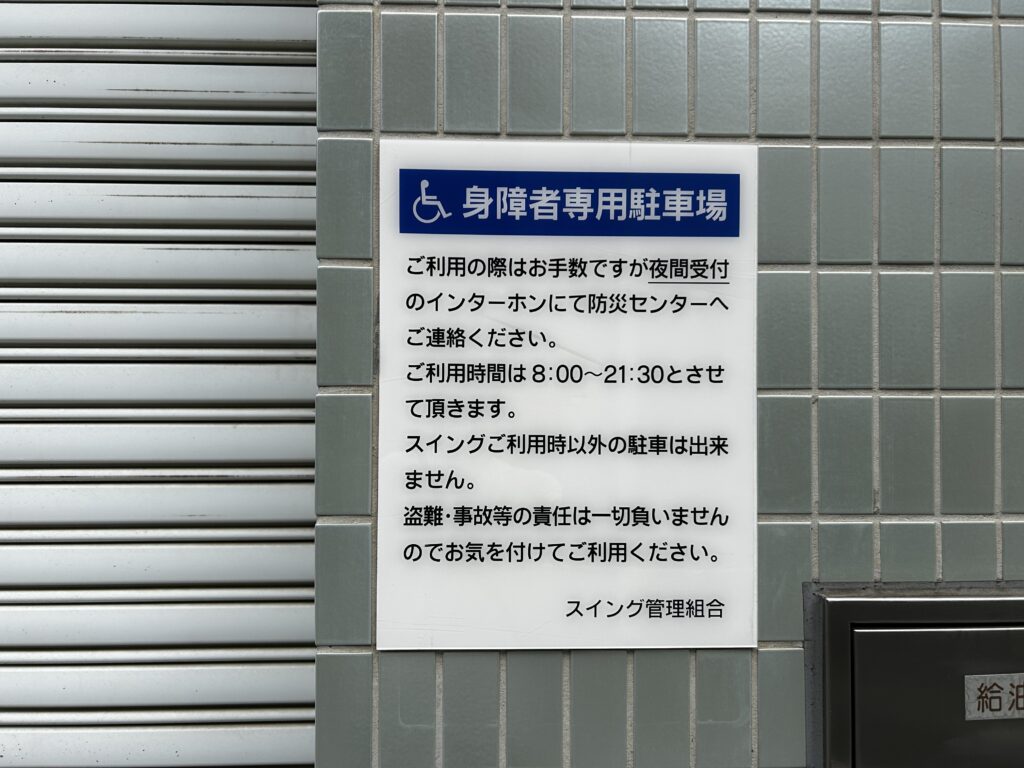 また、「身障者専用駐車場」という区画が1ヶ所、スイングホール側に設定されています。こちらは管理組合に申し出ることで利用できるようでした。(当日はシャッターが降りており、中の様子は見られませんでした)どちらかというとスイングホール利用者向けではないかと思います、