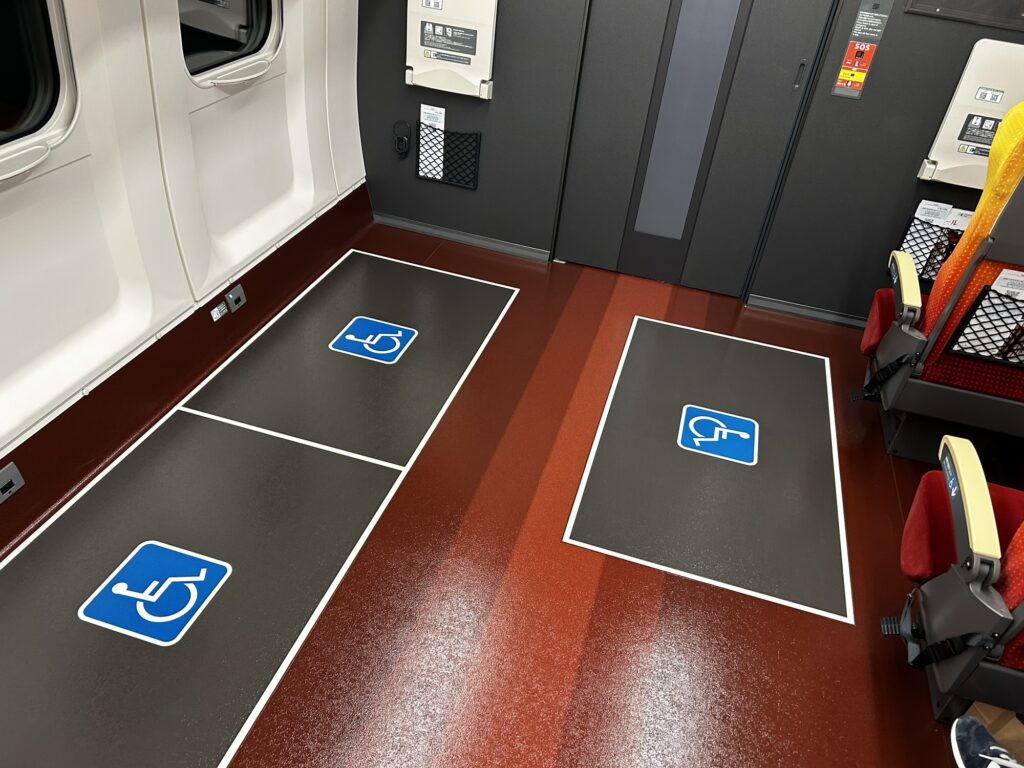 車椅子のまま乗れるスペースが3台分、写真の右側(東京方面に向かって右側)には、座席に移乗して車椅子を固定できる席もあります。
