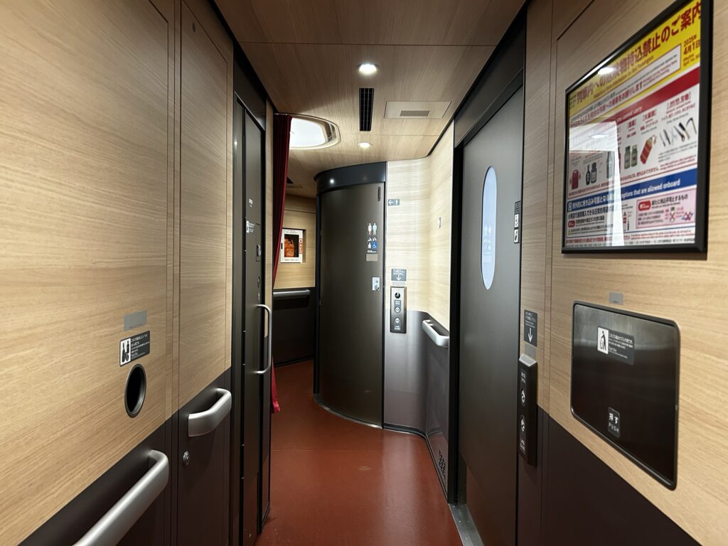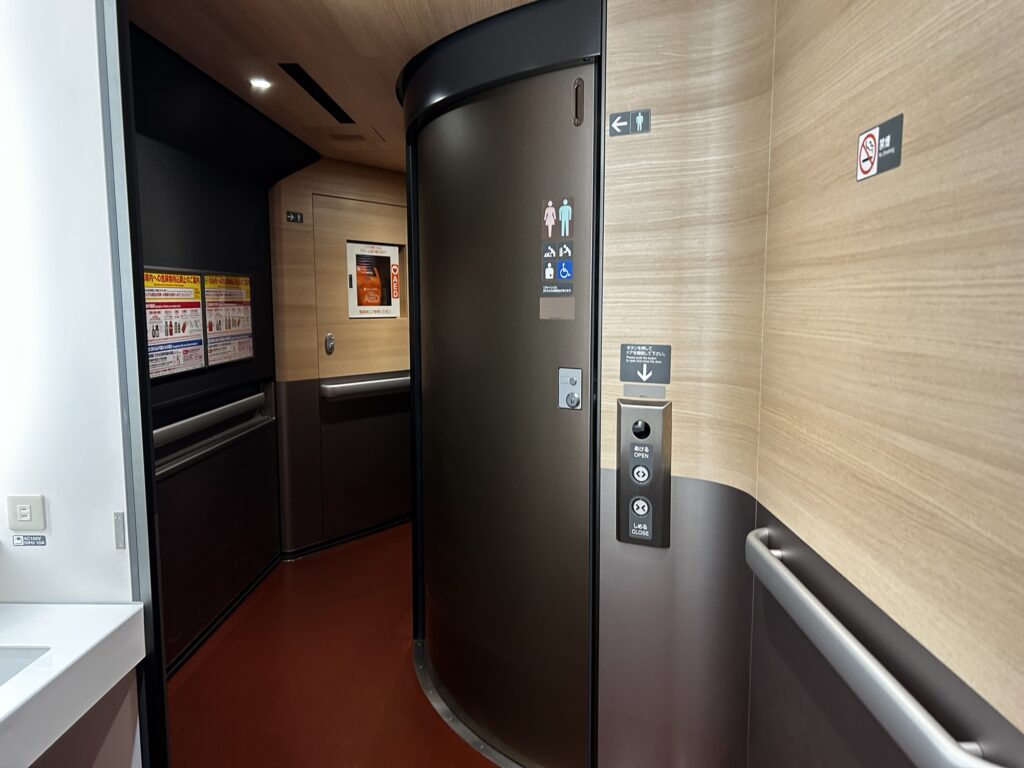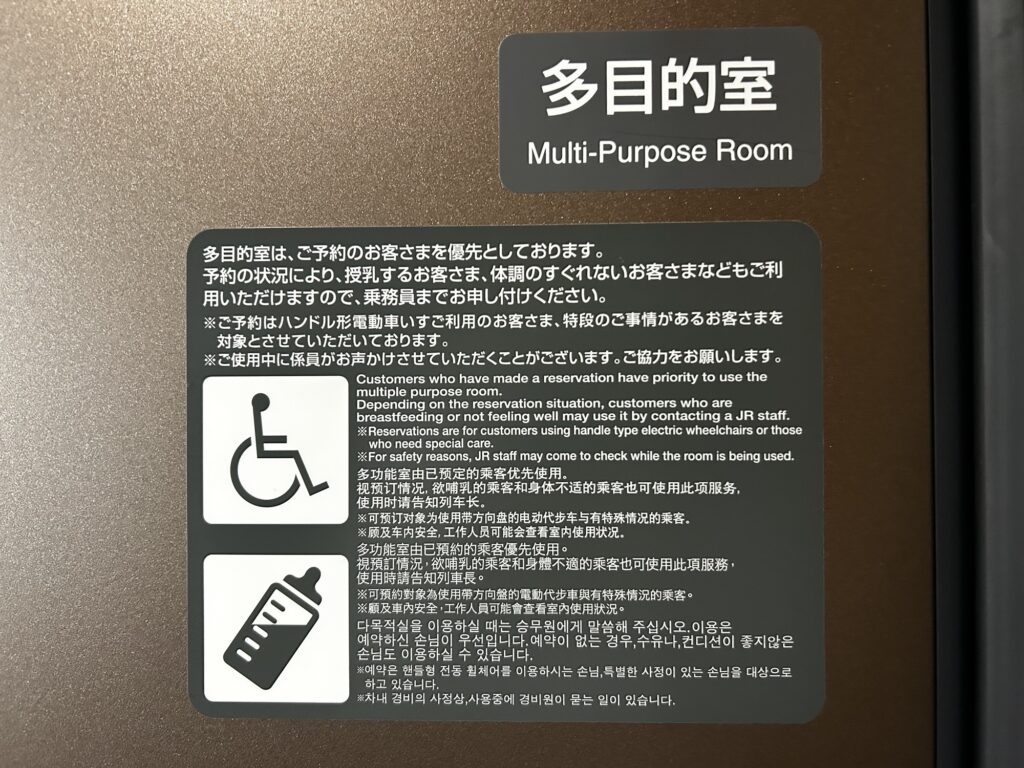 12号車東京側(トイレと多目的室):E8系には予約をして使える多目的室が設置されています。様々な事情で使う必要がある場合にも安心して乗車できると思います。