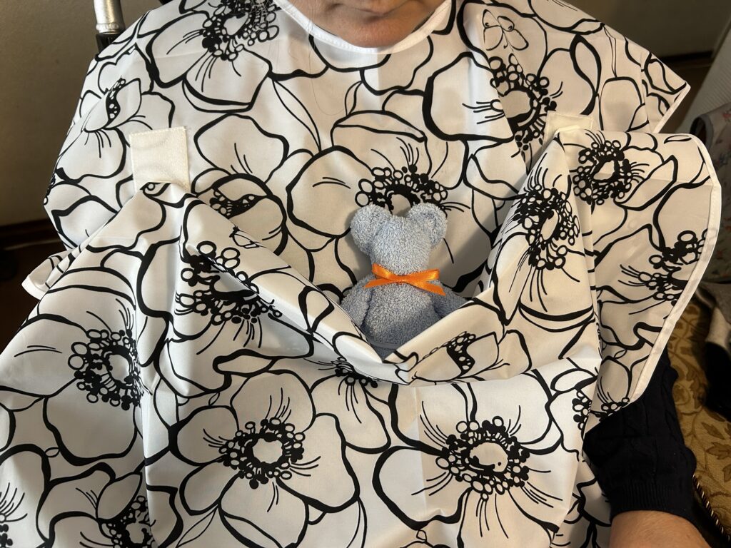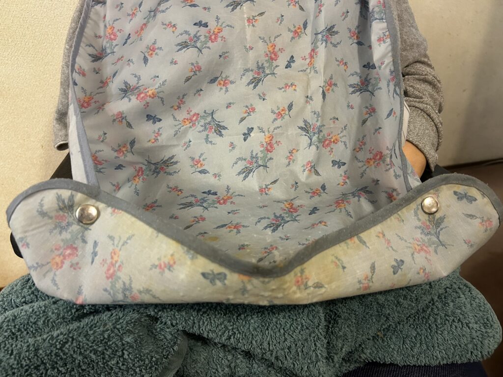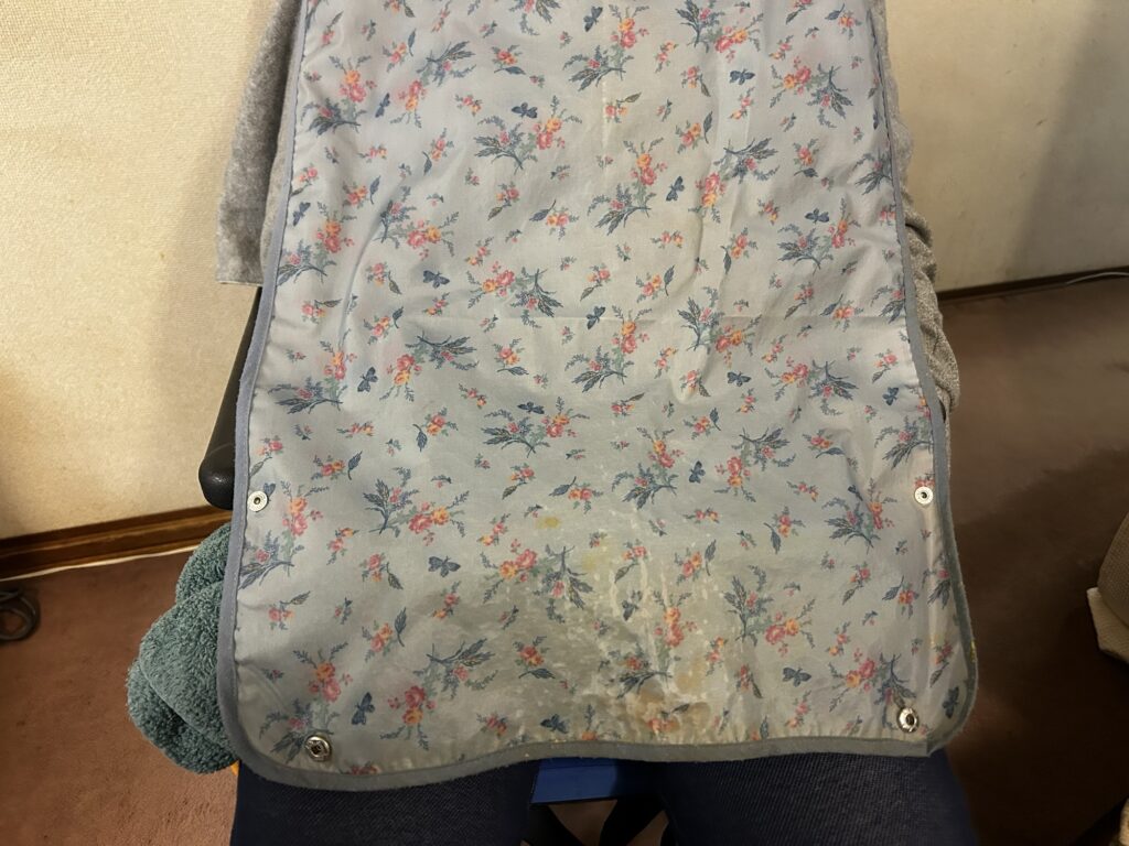 その様子をみていたので「できるだけ口元に近い受け皿を作れるエプロン」を探し求めていましたところで会えたのが、今回のサンヘルパーさんの「ポケットエプロン(防水)」だったのです。