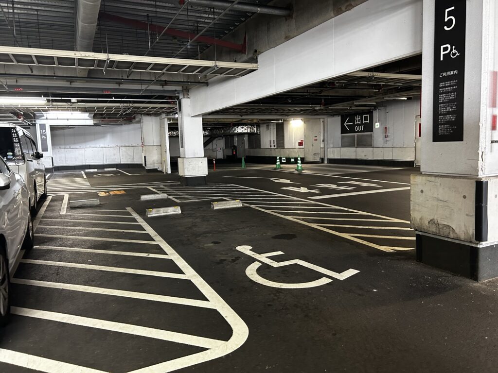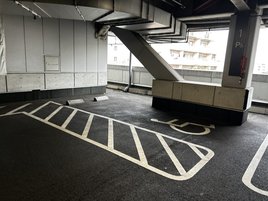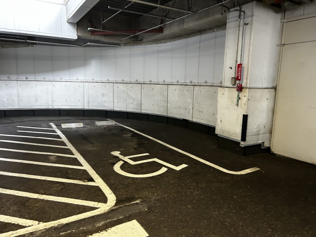 屋内3階部分に無料駐車場があります。車椅子マークが描かれた優先駐車スペースは全部で3台分ありました。都心のスーパーで無料・屋内・複数の車椅子スペースというのはみ珍しいのではないかと思います。