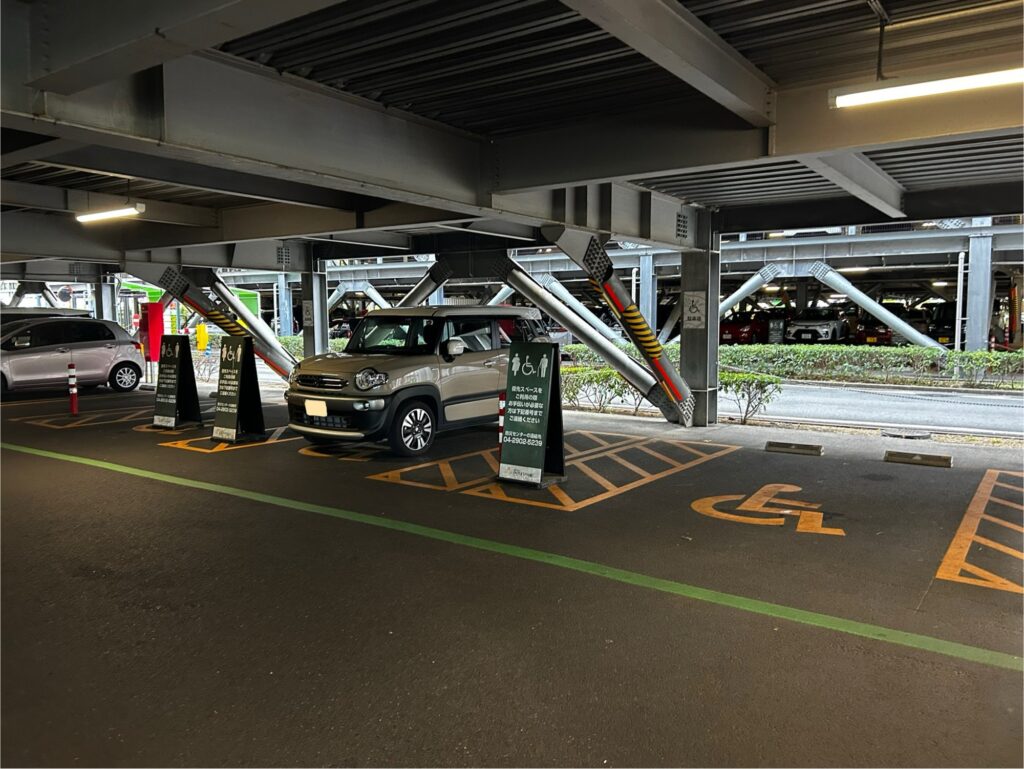 一点気になったのは、各スペースに置かれている立て看板です。こちらが実に重たい💦もし車椅子利用の方が1人で運転していったとすると、移動させるのは少し大変かもしれません。ただし、看板には連絡先が記載されており、お願いすればすぐに対応していただけるとは思います。優先スペースの確保と自由度のバランスは難しいですね。