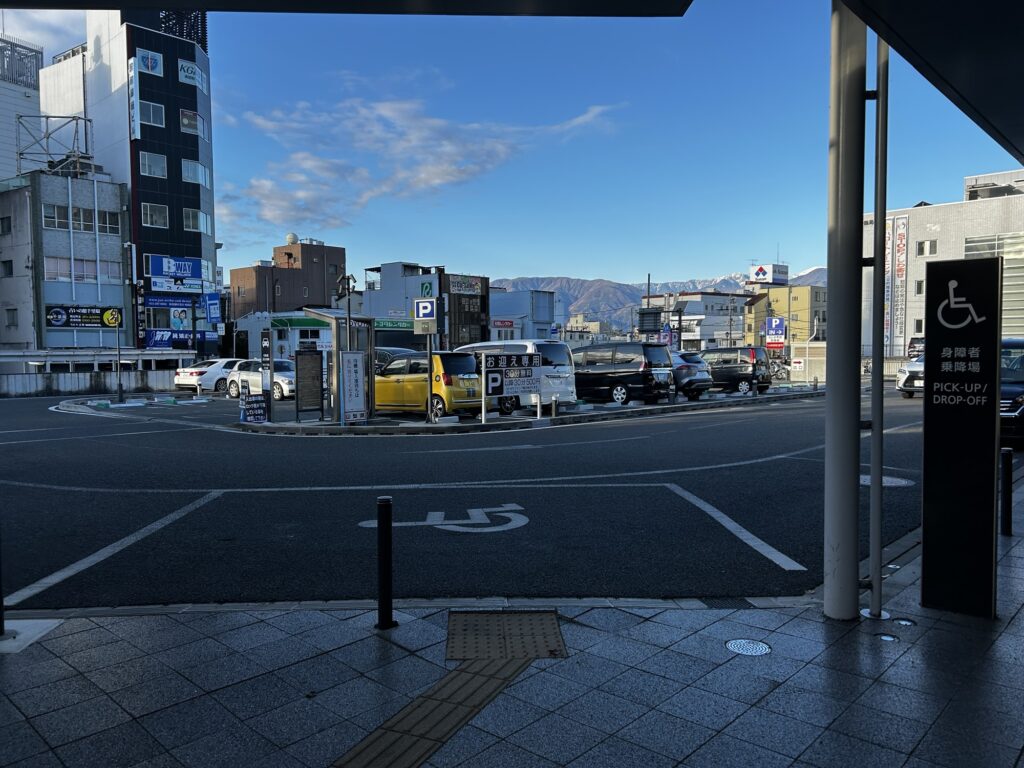 武田信玄公銅像がある甲府駅南口駅前の様子です。駅の送迎用駐車場に「身障者用駐車場」と多機能トイレが設置されています。